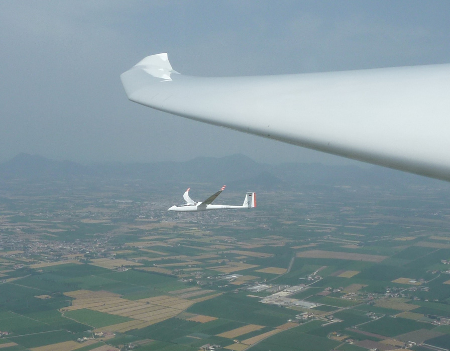 Dopo qualche minuto sgancio e trovo quasi subito un' ascendenza indicata da un bel baffetto nel cielo, metto da parte un po' di quota per poi virare a sud e raggiungere il primo pilone su Cassano 4 km. più giù, il palmare mi indica l'apertura del tema, inverto la rotta e punto verso un paio di cumuli belli grassi. Tra Tortona e Voghera mi trovo piacevolmente in compagnia di Fulvio, ci scambiamo qualche info e proseguiamo per alcuni chilometri insieme con lo stesso obiettivo. In volo l'asw20 è bellissimo da vedere e in planata è decisamente rapido ed efficiente, un vero spettacolo. Mentre giriamo ordinatamente la stessa termica il mio pensiero torna ad un paio di anni fa, quando facevo volare un modellino simile sul pendio vicino a casa, adesso ne ho uno in scala 1:1 a poche decine di metri e lo sto ammirando seduto a 1800m. di quota a bordo di un libelle... trattengo una lacrimuccia e continuo.