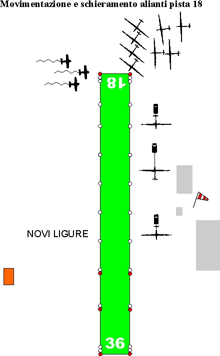 PISTA 18: stesso ragionamento della 36, ma con tutti gli alianti disposti sul lato EST della testata pista.