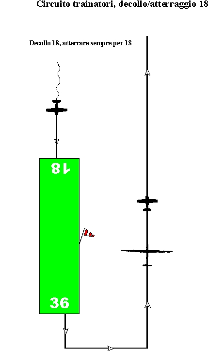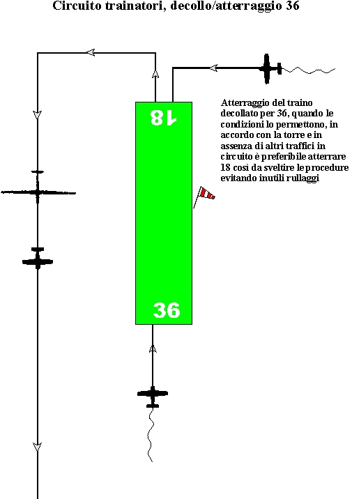 Seguono le indicazioni per i circuiti di decollo e atterraggio riservate ai Trainatori, nel caso della pista 36 e della 18 come riportato nelle figure qui sotto.